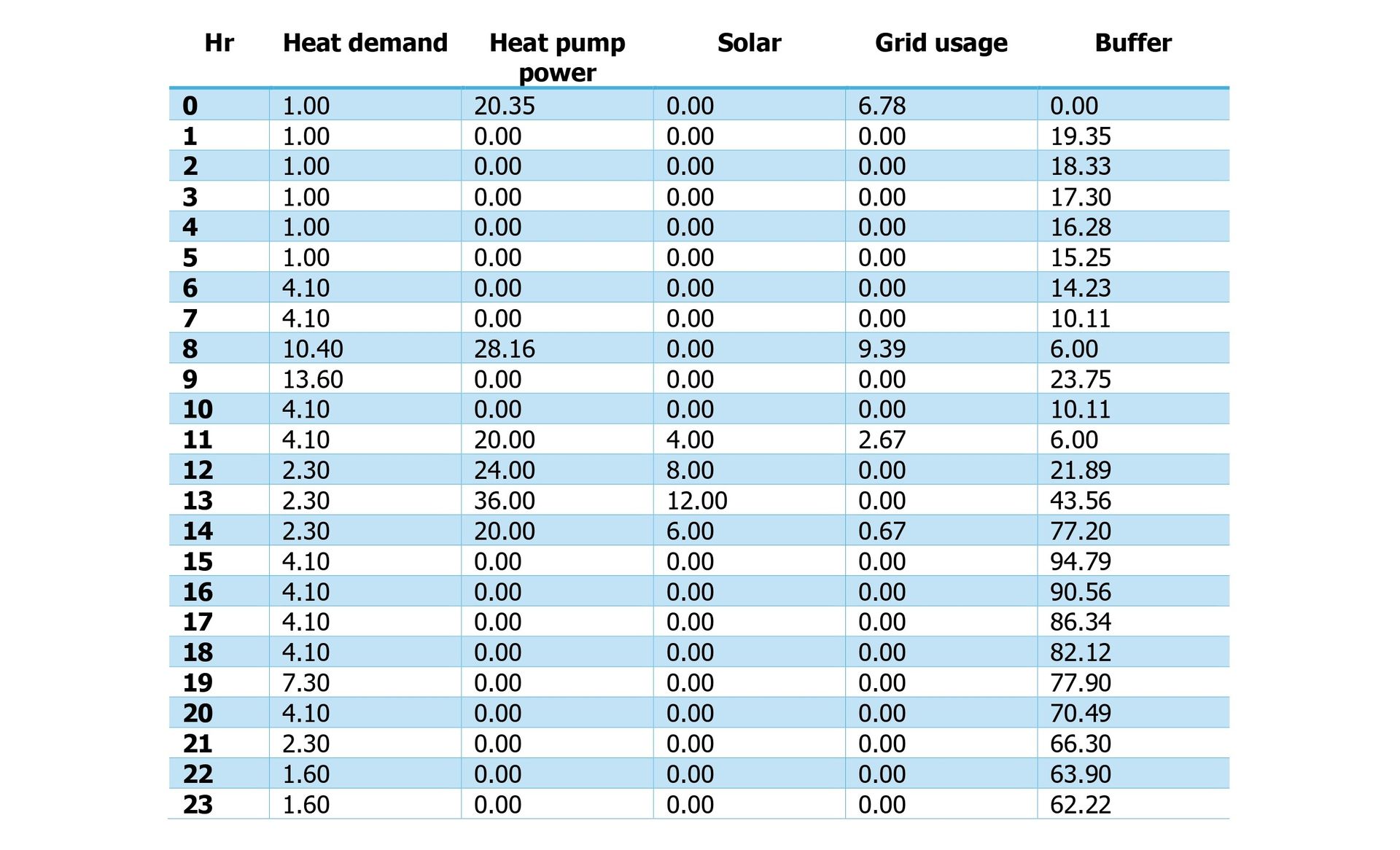 While the heat demand peaks in the morning and late afternoon, solar energy peaks at midday. The model uses solar power as much as possible and adds buffered energy as soon as solar becomes available. Grid power is used in advance to prepare for the morning peak in demand and to maintain the buffer above its defined minimum capacity.